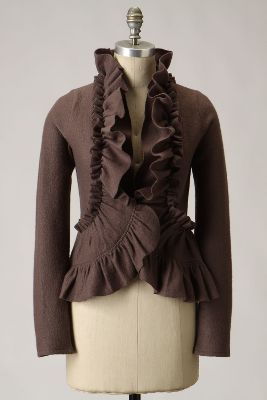 I have been eying this new "Wrapped in Ruffles" sweater from Anthropologie. Whoever started the ruffle phenomenon had me in mind! I love the structure they create on a piece of clothing. You're not just dressing- you're selecting a piece of art. If anyone is looking for a gift for me....
